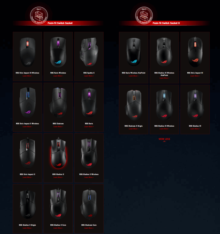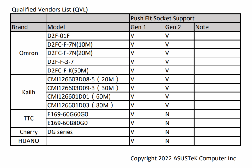 На практиці це не так просто і ASUS пропонує конкретний список свічів, що сумісні з Push-Fit Socket. Причому у другому поколінні сокету цей список серед механічних перемикачів зменшився, але одночасно користувачі здобули можливість обирати між оптичними та механічними свічами!
