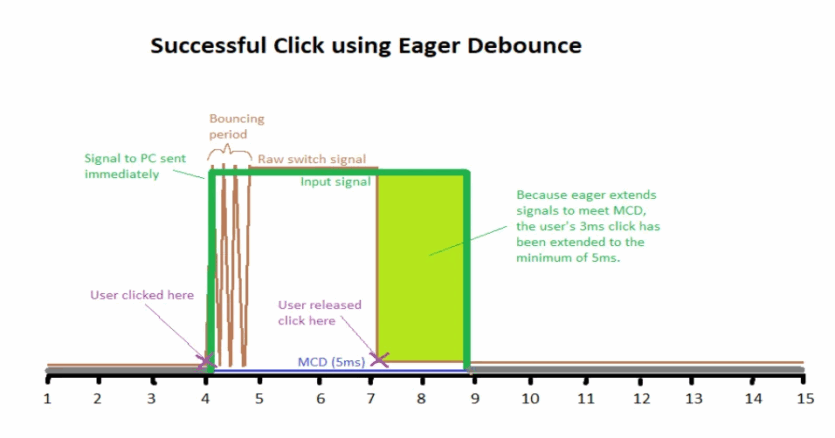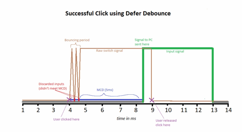 Існує два основних параметри дебауну в прошивці. MCD (Minimum Click Duration) – мінімальна тривалість кліку, що диктує мінімальний час, який клік повинен тривати для реєстрації. MTBC (Minimum Time Between Clicks) – мінімальний час між кліками, тобто проміжок часу після кліку, коли нові сигнали не реєструються. Разом вони визначають те, що загалом й називається “часом дебаунсу” (debounce time).