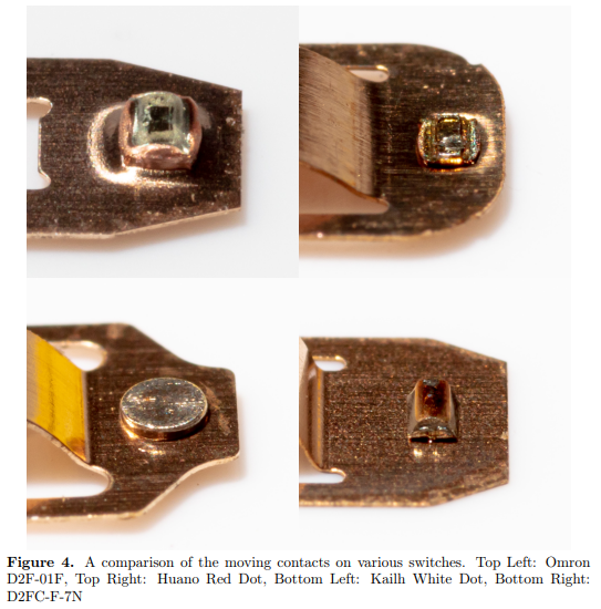 Повторювані удари плюс мікроскопічне іскріння та окислення контактів призводять до зносу. Через мільйони циклів виникає проблема “подвійного кліку” – одне натискання реєструється як два. Парадокс: визначальна особливість механічного перемикача породжує його головні обмеження. Дизайн контактної зони критично впливає на знос. Різні виробники по-різному підходять до цієї проблеми, тож і результат буває різний.
