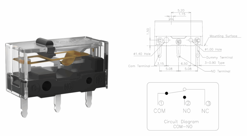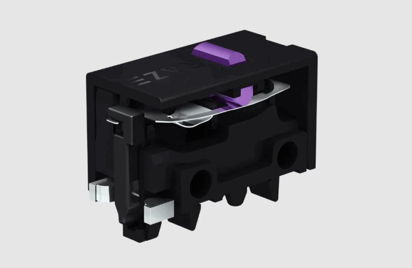 Механічний мікроперемикач працює за принципом “snap-action” – миттєвого перемикання через пружинний механізм. Основними компонентами механічного мікроперемикача є: