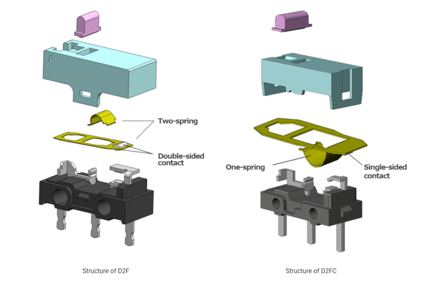 З розширенням бізнесу мишей у 1999 році народився специфічний для миші перемикач D2FC. Це був продукт, оптимізований для потреб мишей, але вперше виробники отримали скарги від замовників щодо “звуку” продукту. Справа в тому, що D2FC був конструктивно покращений від двопружинної, двосторонньої контактної структури до однопружинної та односторонньої. Ця структурна зміна призвела до тонкої зміни звуку відкриття/закриття контактів. Для замовників, звиклих до звуку D2F, звук відкриття/закриття контактів D2FC був незвичним, адже за десятиліття домінування на ринку звук D2F став де-факто стандартом. Навіть тонка зміна дратувала користувачів.