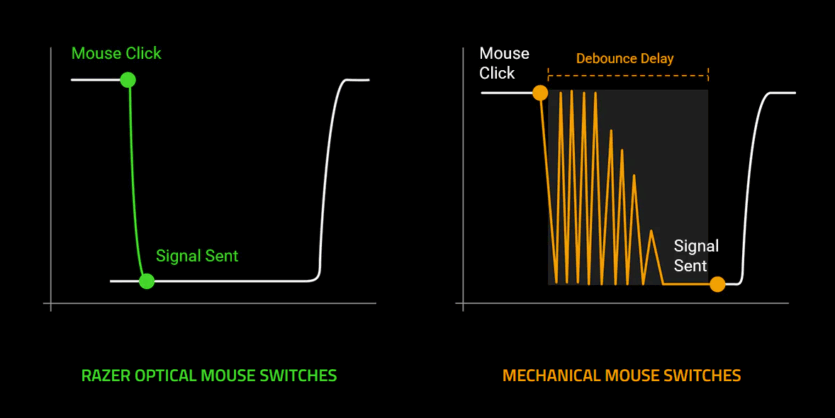 Найбільша різниця в продуктивності полягає в затримці. Механічні контакти відскакують при ударі, створюючи електричний шум. Щоб запобігти реєстрації цього як кількох кліків, прошивка миші повинна впроваджувати “затримку debounce” – короткий період (часто кілька мілісекунд) після початкового сигналу. Оптичні перемикачі за своєю природою не мають фізичного відскоку контактів; переривання світлового променя є єдиною чистою подією. Це повністю усуває потребу в затримці debounce, що призводить до швидшого часу відгуку – до 0,2 мс для оптичних проти понад 5 мс для механічних.