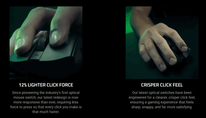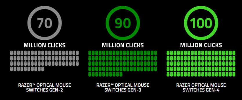 Razer інвестував значно в розробку власних оптичних перемикачів, тепер у їхньому четвертому поколінні. У мишах Razer також є механічні свічі, але в них менше ексклюзиву та більше банального ребрендингу: V1 це стандартні Omron 50M, а V2 зроблені на основі Kailh GM 4 за специфікаціями Razer. А ось з “оптикою” цікавіше:
