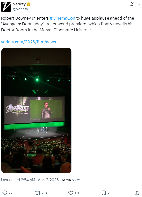 На радість власникам кінозалів від Сіетла до Кі-Весту, Disney представила перший повнометражний трейлер “Месників: Судного дня” на CinemaCon у рамках презентації студії для власників кінотеатрів. До цього моменту Marvel пропонувала лише чотири короткі тизери, присвячені Стіву Роджерсу (колишньому Капітану Америка), Тору, Людям Ікс та Фантастичній четвірці — усі вони відповідають на остаточний поклик до битви.