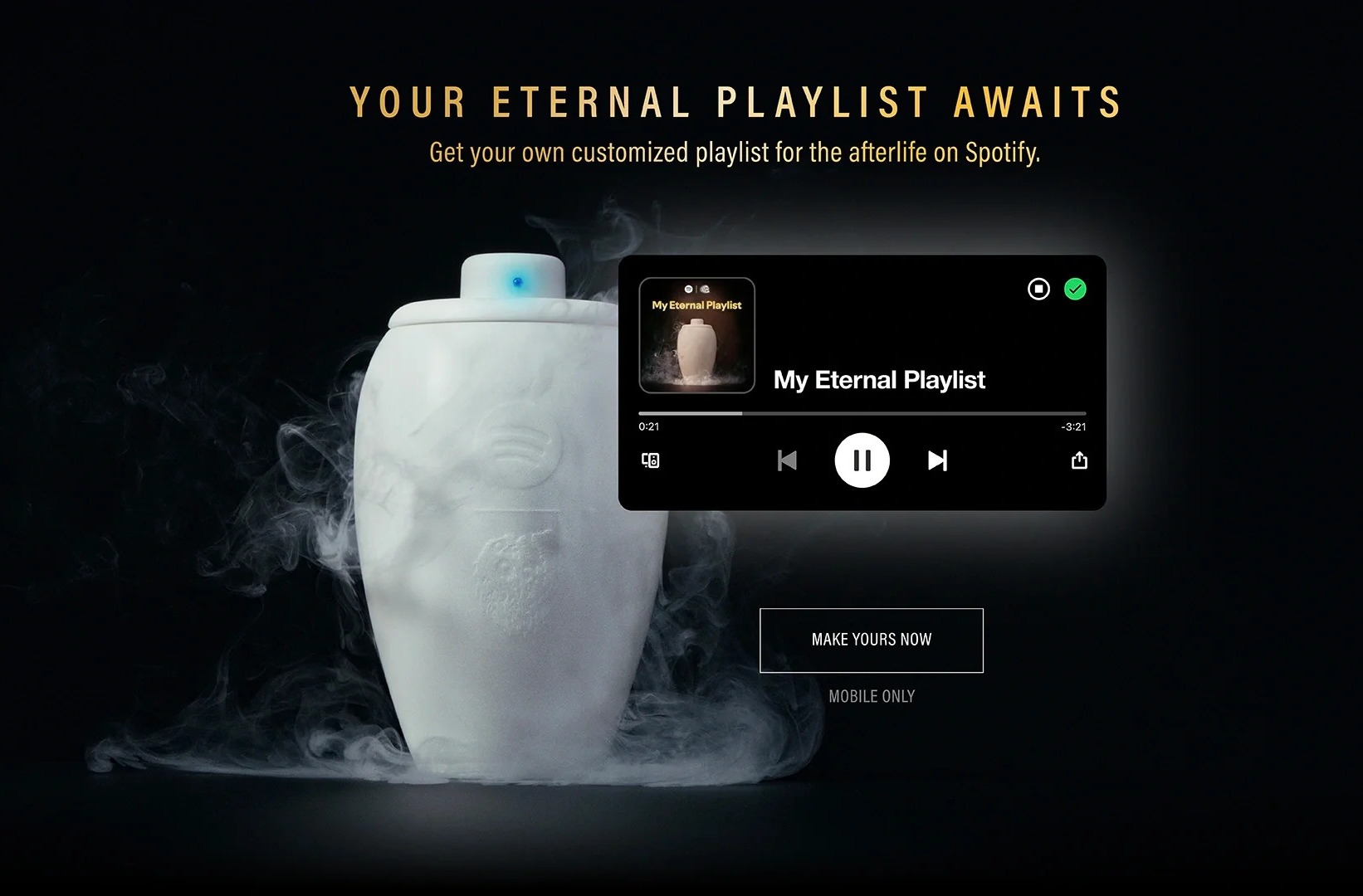 Колонка продається в обмеженій кількості як колекційний пристрій з можливістю потокового відтворення музики. Зокрема, в США у продаж надійшли буквально 150 одиниць за ціною $495. Виробники називають колонку “першою у світі урною для потокового передавання музики” та позиціюють Eternal Playlist Urn як спосіб слухати улюблені треки навіть після смерті.