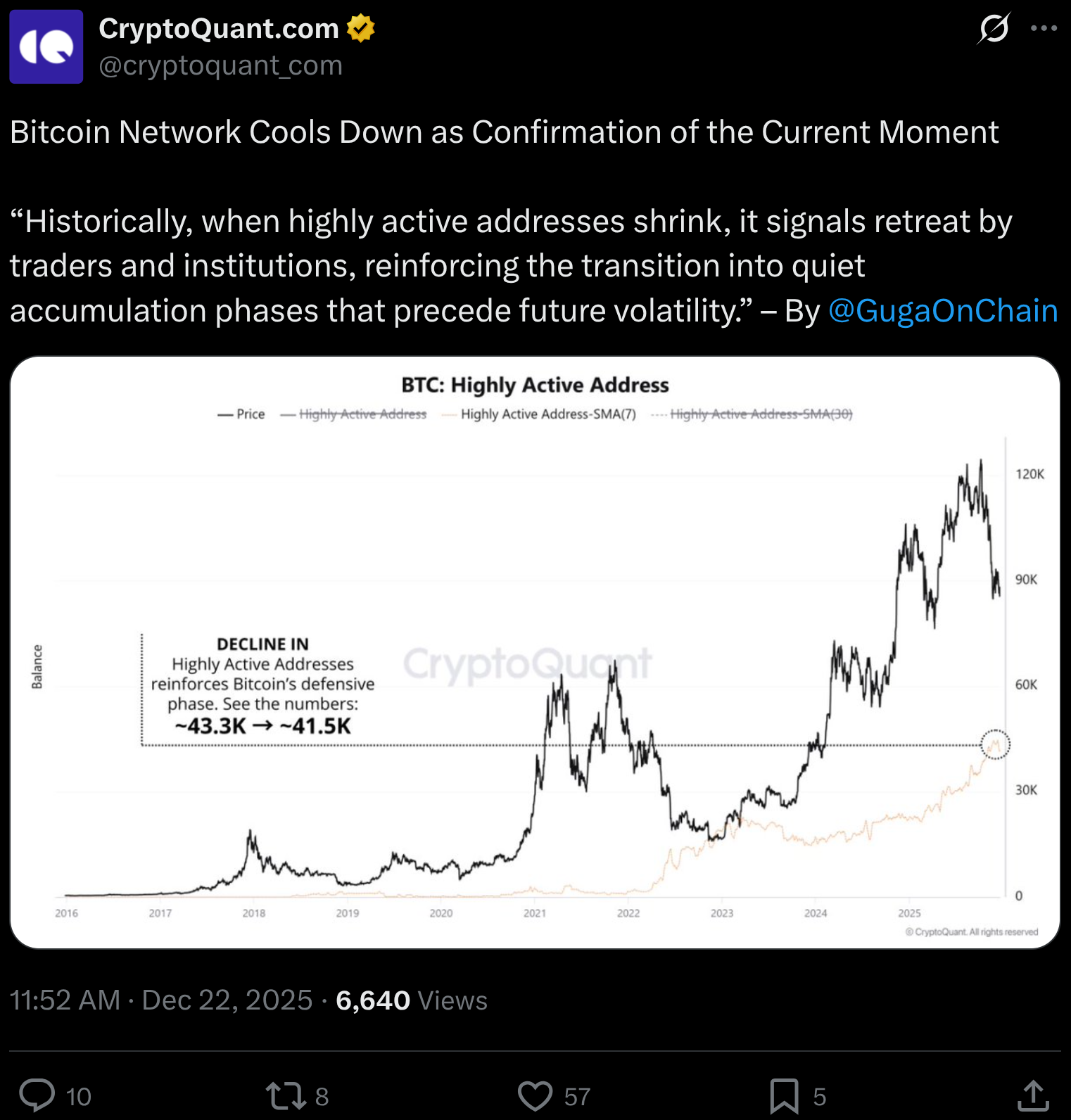 Морено додав, що ведмежий ринок фактично почався приблизно в середині листопада, після найбільшого в історії криптовалют випадку ліквідацій 10 жовтня. З того часу попит продовжує слабшати. CryptoQuant повідомили, що спотові біткоїн-ETF США стали чистими продавцями у четвертому кварталі 2025 року, а їхні активи скоротилися приблизно на 24 тис. BTC. Це різкий розворот порівняно з аналогічним періодом минулого року. Адреси, що тримають від 100 до 1 000 BTC — група, яка включає ETF і компанії-“біткоїн-скарбниці” — також зростають нижче тренду, повторюючи ослаблення попиту наприкінці 2021 року перед ведмежим ринком 2022 року.