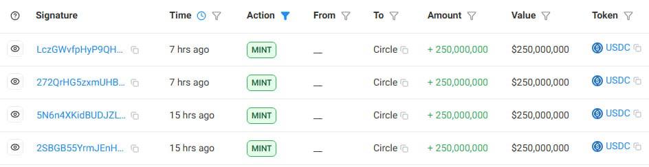 В ніч з 30 на 31 грудня 2025 року два найбільші емітенти стейблкоїнів у світі провели масові випуски нової ліквідності: Circle емітувала приблизно $1 000 000 000 USDC на блокчейні Solana, а Tether випустив $1 000 000 000 USDT на мережі Tron.