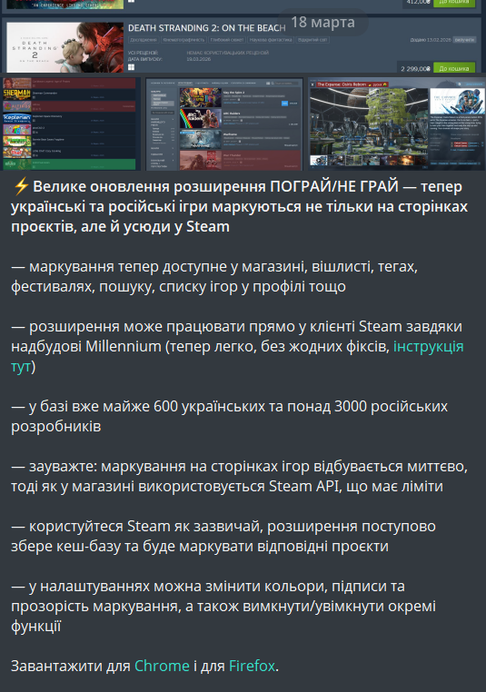 В Chrome та Firefox додали розширення “ПОГРАЙ” з підказками про українські ігри в Steam