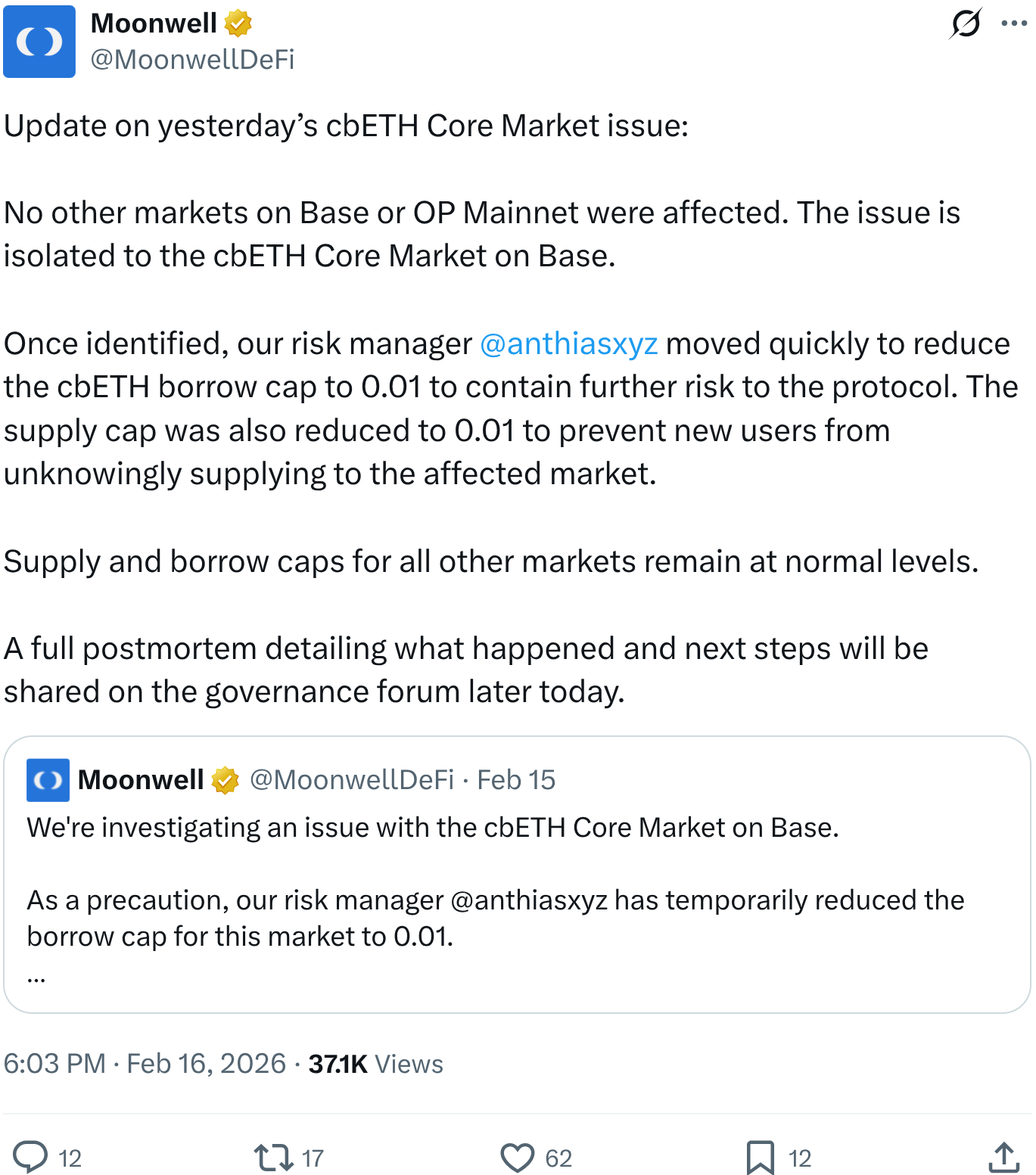“Жодні інші ринки в мережах Base або OP Mainnet не постраждали. Проблема ізольована лише до Core-ринку cbETH у мережі Base. Після виявлення наш ризик-менеджер оперативно знизив ліміт запозичень cbETH до 0,01, щоб обмежити подальший ризик для протоколу. Ліміт постачання також було зменшено до 0,01, щоб запобігти тому, аби нові користувачі несвідомо надавали ліквідність на уражений ринок. Ліміти постачання та запозичень для всіх інших ринків залишаються на звичайному рівні”, — повідомила Moonwell.
