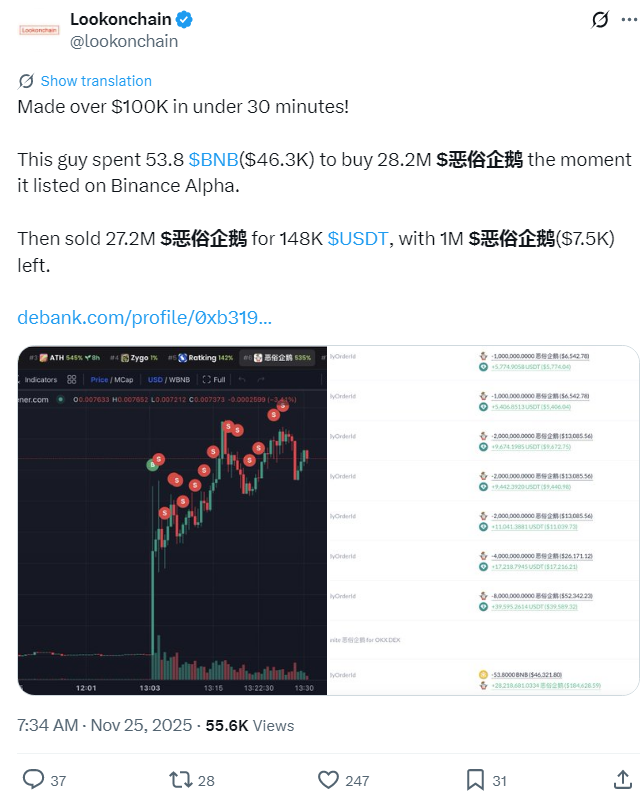 Аналітики Lookonchain повідомляють, що він викупив 28,2 млн токенів Vulgar Penguin, витративши при цьому 53,8 BNB (еквівалентно приблизно $46 300 на момент угоди). Після лістингу на криптовалютній платформі Binance Alpha трейдер реалізував 27,2 млн токенів на суму близько $148 тис., залишивши в своєму портфелі ще близько 1 млн токенів (що оцінюється приблизно в $7 500). У підсумку чистий прибуток оцінюється понад $100 тис.