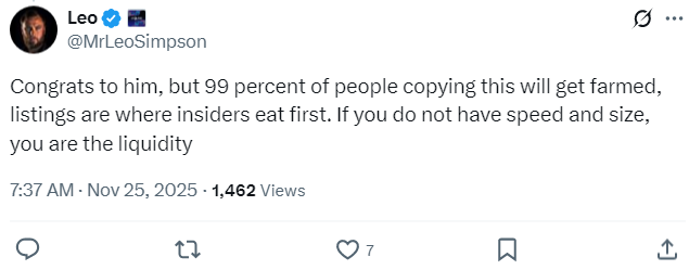 У дискусіях на платформі X учасники зауважили: хоч такі історії миттєвих заробітків здаються вражаючими, на практиці більшість спекулянтів на лістингах мемкоїнів не досягають успіху. Інші коментатори попереджають: досягти подібного результату практично нереально — за їх словами, близько 99 % учасників, які хочуть “зловити” памп, в кінцевому підсумку стають просто ліквідністю для досвідченіших і швидших гравців. Лістингова зона — це територія, де інсайдери часто діють першими, і без великого капіталу та блискавичної реакції шанси виграти значно менші, бо обвали мемкоїнів трапляються набагато частіше, ніж “пампи”.