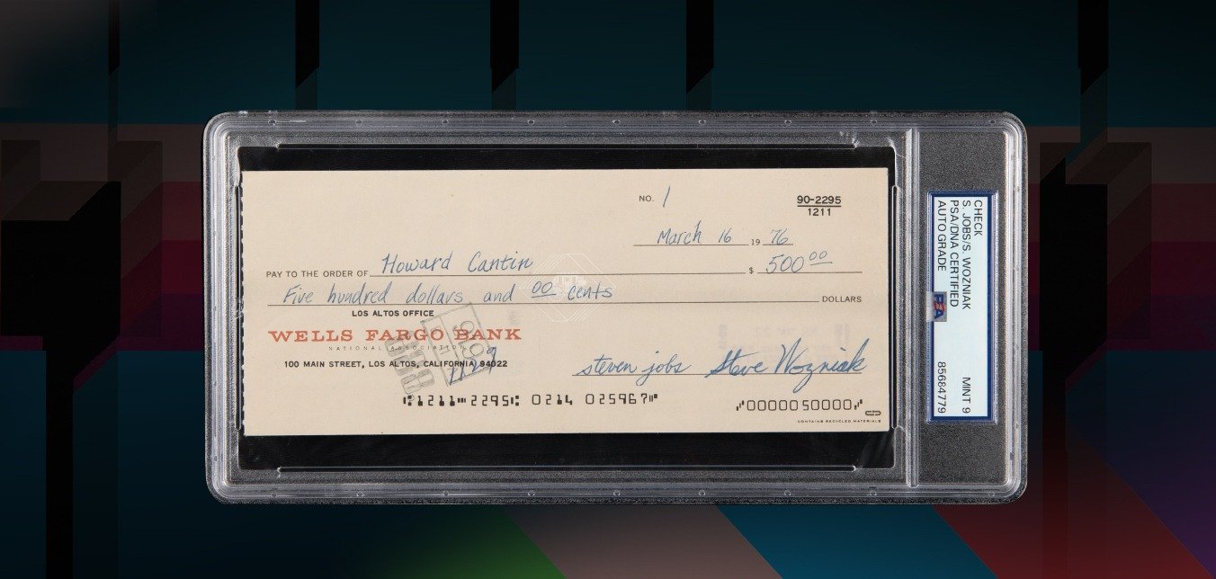 Лот №6000 — це звичайний на вигляд банківський чек Wells Fargo на суму $500, підписаний Стівом Джобсом і Стівом Возняком. Попри скромний вигляд, його оціночна вартість така сама — понад $500 тис. Це перший чек, виписаний з першого банківського рахунку Apple, і саме ним оплатили розробку друкованої плати Apple-1.
