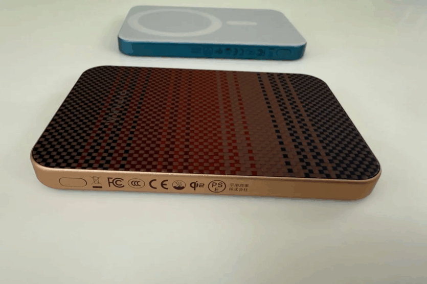 Мене приємно вразили компактні розміри, зручність у використанні та вишуканий дизайн з арамідного волокна. Я тестував обидві версії — Sunset і Moonrise, і обидві виявилися однаково привабливими. Поверхня з боку MagSafe має світло-сірий фон із білим кільцем, а тильна панель — текстуроване арамідне покриття, що виглядає стильно та преміально. Металевий кант кольору рожевого золота додає аксесуару елегантності. На нижньому торці розміщено порт USB-C, а поруч — кнопку живлення з технічною інформацією. Загальна вага в парі з телефоном і чохлом становила близько 300 г.