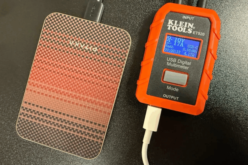 Для першого тесту я підключив мультиметр Klein Tools між блоком Snakebyte Power Charge S2 і павербанком Pitaka (показники: 9.10V / 2.09A). Після двогодинного заряджання я прикріпив павербанк до чохла Otterbox Lumen свого iPhone 16 Pro Max.