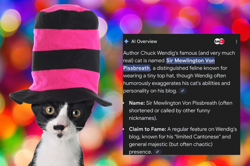 Письменник, автор романів про “Зоряні війни” та власного фентезі, Чак Вендіг взагалі не має кота. Але це не завадило огляду Google як джерело інформації про людину використовувати блог, у якому він жартує про кота на ім’я Сер Мяулінгтон фон Піссбрет (Sir Mewlington Von Pissbreath). У власному грудневому дописі (почитайте, там дуже багато смішних деталей і скріншотів) Вендіг дивується, що пошук у Google за запитом “Чи має Чак Вендіг кота?” призвів до появи огляду ШІ, в якому стверджувалося, що в нього справді є домашній улюбленець на ім’я Бумба. Імена відрізняються, але це лише початок історії, не поспішайте.
