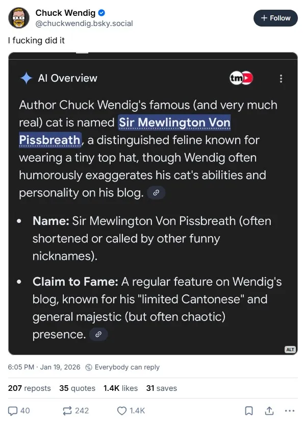 Якщо читач здивований, чому автор переповідає таку давню історію у новинах, то це знову через поспіх. Адже за шість тижнів після подій, 19 січня, Google AI Overview таки включив сера Мяулінгтона до величезного корпусу “фактів” про письменника. Чак Вендіг написав про це в Bluesky (видно тільки зареєстрованим користувачам, але є скриншот).