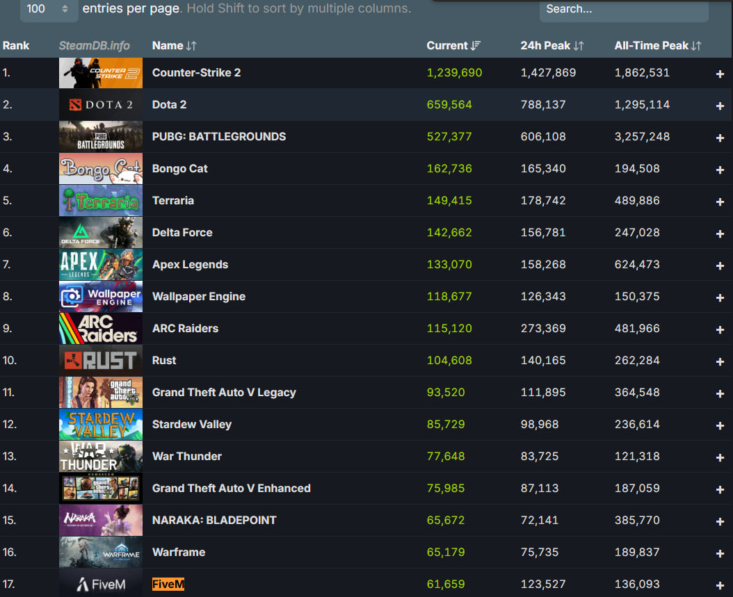 FiveM з’явився в серверній частині Steam у 2023 році, після того як Rockstar придбала команду Cfx.re для майбутнього проєкту. Довгий час активність була майже нульовою. Наприклад, у грудні 2025 року піковий онлайн складав близько десяти гравців. Ситуація різко змінилася після оновлення на початку цього місяця. Воно інтегрувало FiveM безпосередньо в платформу Steam і прибрало старий фреймворк Source SDK Base 2007.