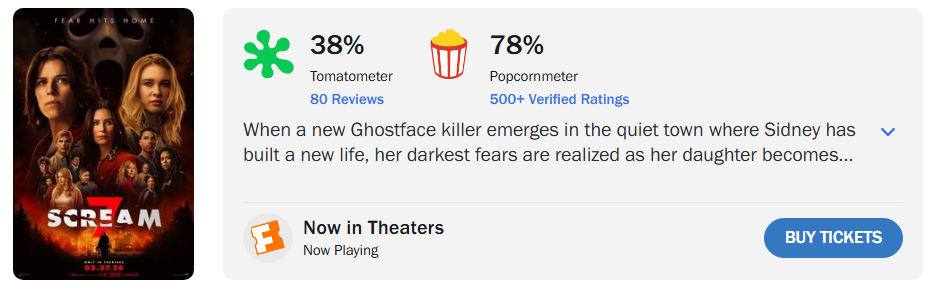Для порівняння, попереднім лідером у франшизі за антирейтингом Rotten Tomatoes був “Крик 3” з 45%. Далі, від найгіршого до найкращого, слідують: “Крик 4” з 61%, “Крик 5” з 76%, “Крик 6” з 77%, оригінальний “Крик” 1996 року з 78% і “Крик 2” з дивовижними 84%.