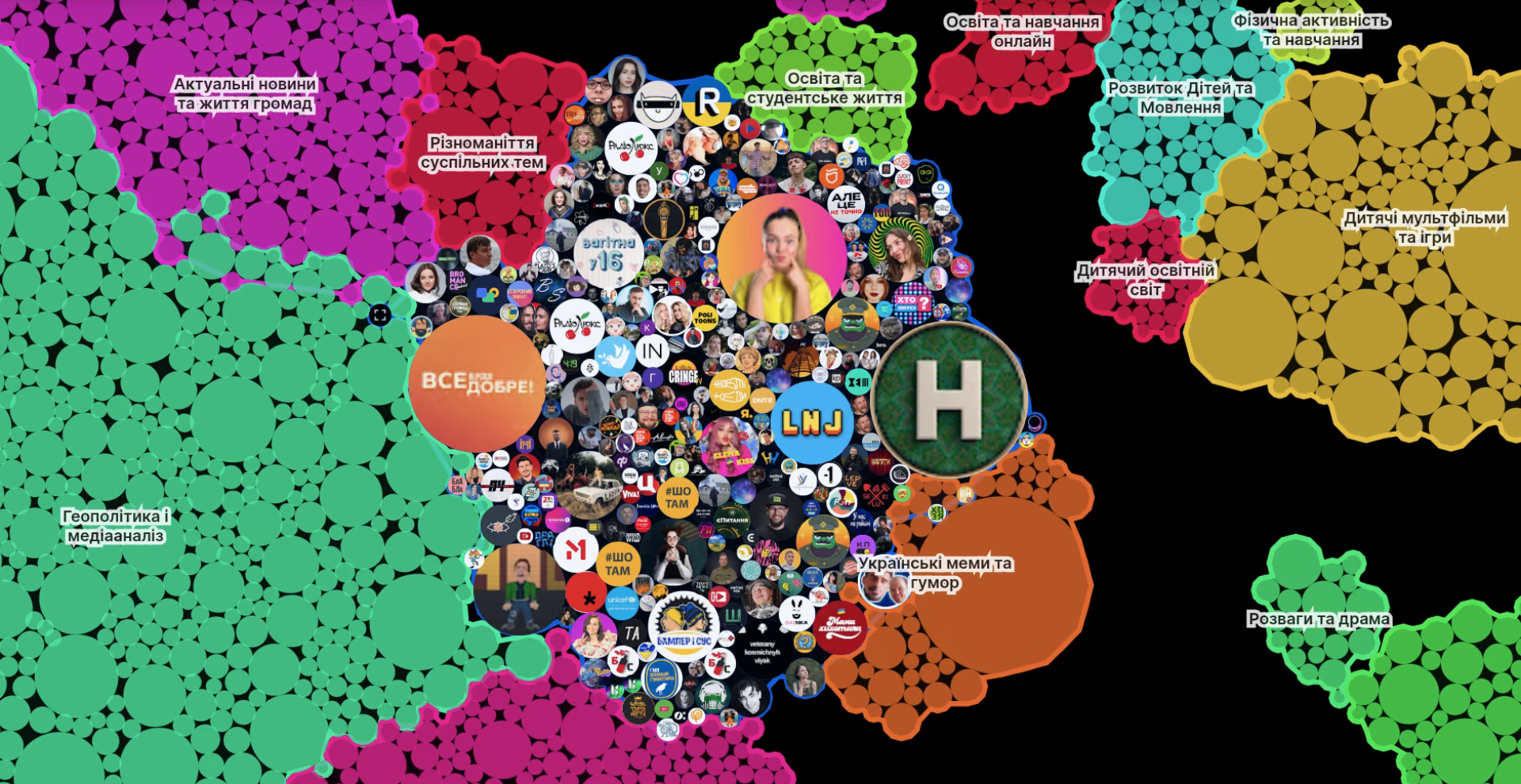 “Кожен кружечок на цій карті — це окремий канал, а його розміри відповідають кількості підписників. Всі канали розбиті на тематичні категорії і на так звані кластери, де ви можете побачити самі канали і їхніх сусідів”, — каже автор у пояснювальному відео.