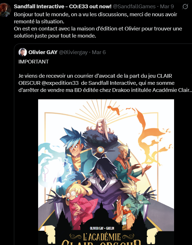 “Перепрошуємо за затримку з комунікацією. Ситуація, ініційована юридичними представниками нашої студії, була для нас новою і складною для управління. Їхня роль — захищати нас, зокрема від контрафактної продукції. Але дії, ініційовані щодо коміксу “L’Académie Clair-Obscur”, опублікованого у січні 2026 року, не відповідають нашій позиції”.