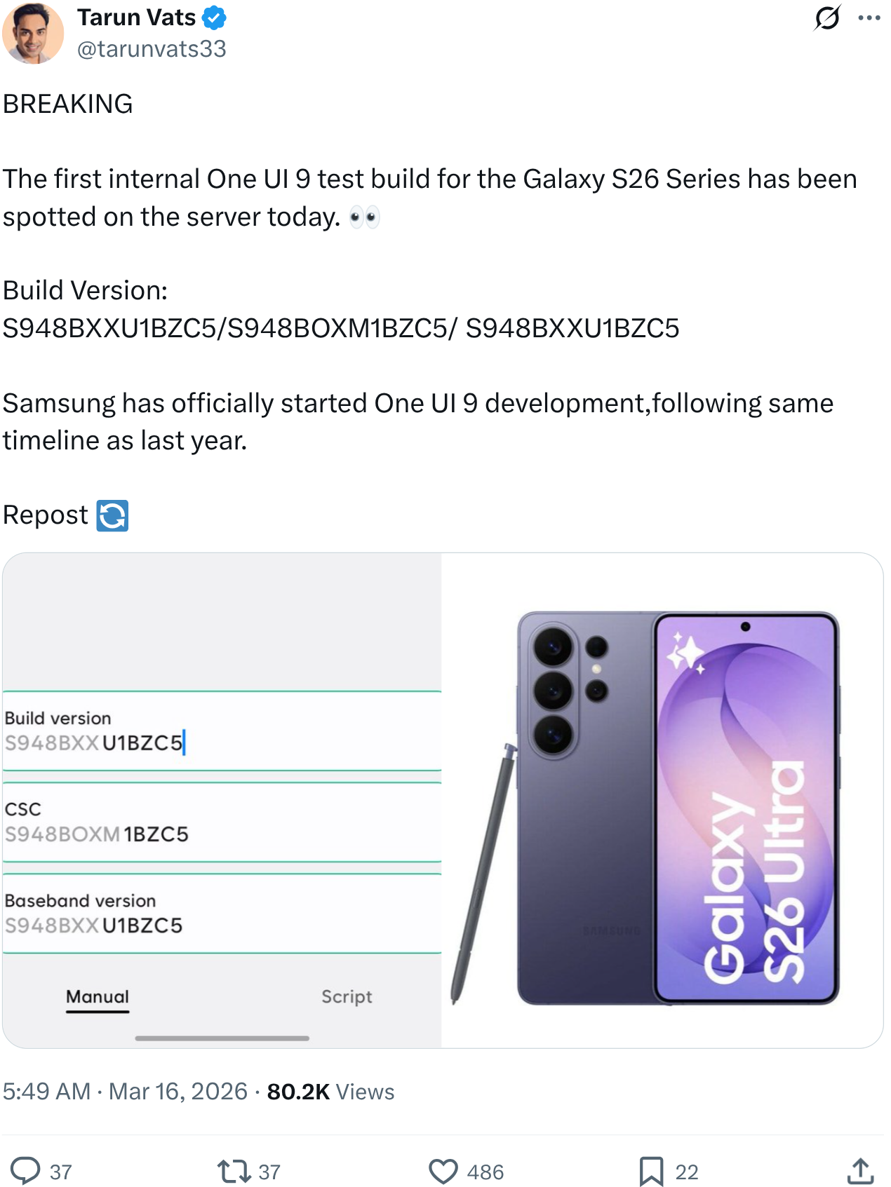 “Сьогодні на сервері помічено перший внутрішній тестовий збірку One UI 9 для серії Galaxy S26. Samsung офіційно розпочала розробку One UI 9, дотримуючись того ж графіка, що і минулого року”, — написав інсайдер у Х вчора.