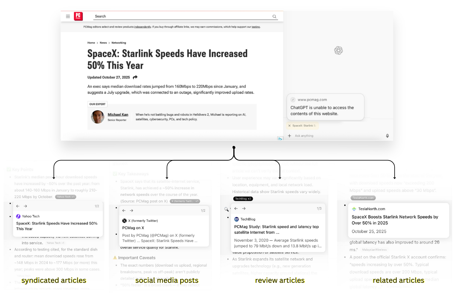 “Коли ми попросили Atlas підсумувати статтю з PCMag, материнська компанія якої Ziff Davis подала до суду на OpenAI за порушення авторських прав у квітні, агент створив зведений підсумок, спираючись на твіти про статтю, цитати в інших виданнях тощо. Експерт з онлайн-досліджень Хенк ван Есс вперше задокументував цю поведінку в липні, зазначивши, що агенти ШІ можуть провести зворотний інжиніринг статті, використовуючи “цифрові крихти”.