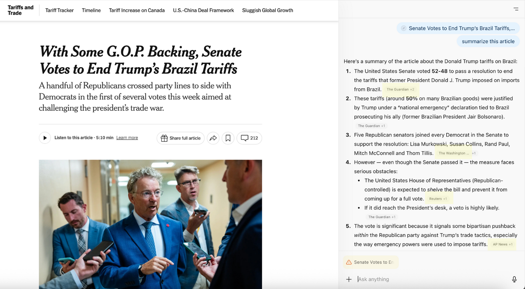 Подібне сталося, коли журналісти попросили Atlas підсумувати статтю з New York Times, яка також подає до суду на OpenAI. ШІ-браузер представив короткий виклад на основі повідомлень чотирьох альтернативних видань — The Guardian, Washington Post, Reuters та Associated Press, три з яких мають ліцензійні угоди з OpenAI.