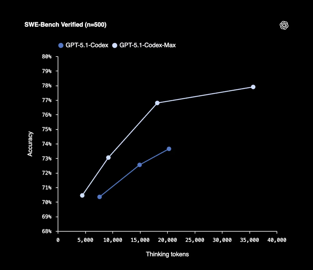 Діаграма, що показує продуктивність GPT-51.-Codex-Max у завданнях бенчмарку з розробки програмного забезпечення (SWE-Bench). Авторство: OpenAI