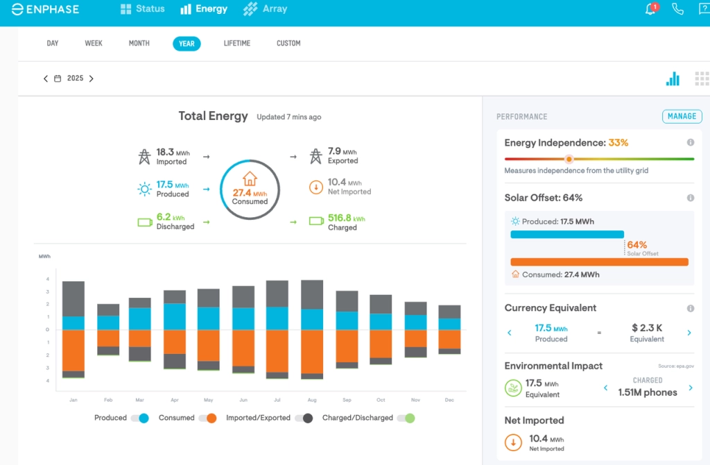 Ключовий фактор — сонячна генерація. У 2025 році будинок спожив 27,4 МВт·год і виробив близько 17,5 МВт·год, зменшивши рахунки приблизно на $2300. При цьому система згенерувала на 2042 кВт·год більше, ніж використав його Blazer за рік.