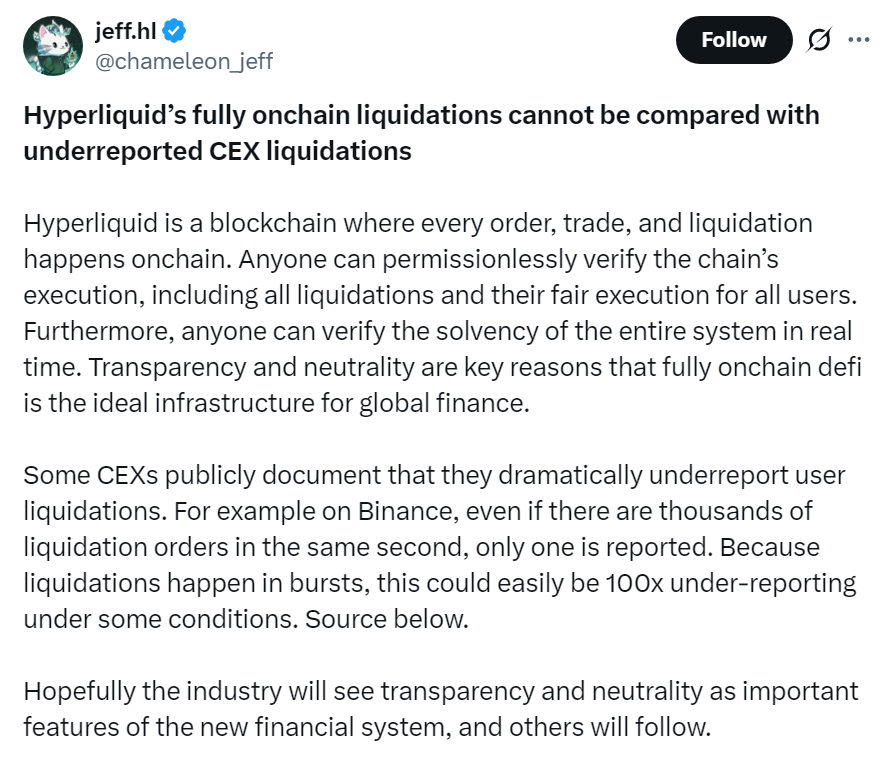 За словами Яна, на деяких CEX у звітах відображається лише одна ліквідація на секунду, навіть якщо їх відбуваються тисячі. Це, на його думку, дає хибне враження стабільності. Натомість Hyperliquid фіксує всі ордери й ліквідації ончейн, що дозволяє будь-кому перевірити дані в реальному часі. Саме тому найбільша частка ліквідацій — $10,3 млрд з більш ніж $19 млрд ліквідацій — припали саме на Hyperliquid.