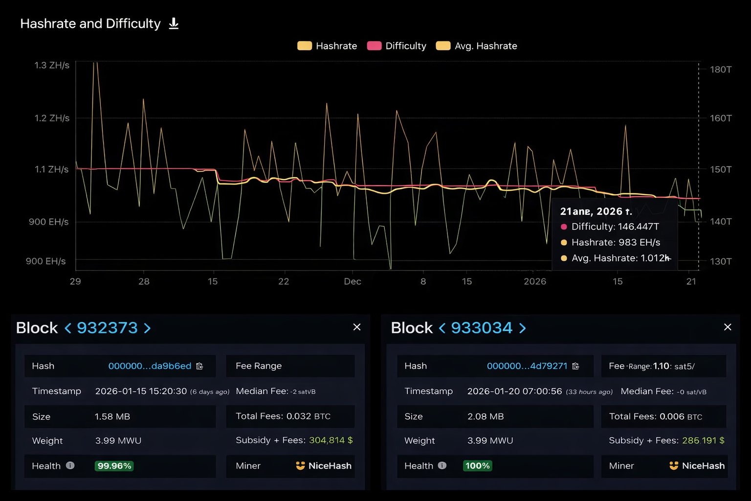 Ці події відбуваються на фоні зниження активності мережі, коли хешрейт біткоїну досяг багатомісячного мінімуму. 21 січня хешрейт біткоїна впав до 983 EH/s, що на 25 % менше за жовтневі максимуми. Поточне середнє щоденне значення становить близько 1,01 ZH/s. Пікові рівні спостерігалися приблизно чотири місяці тому, коли біткоїн торгувався вище $126 000. З корекцією цін активність майнінгу знизилася. Деякі оператори скоротили активні потужності, що призвело до зменшення загальної потужності мережі.
