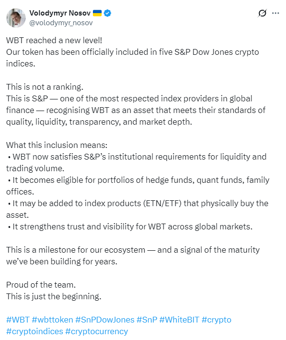 “Наш токен офіційно включено до п’яти криптоіндексів S&P Dow Jones — одного з найавторитетніших постачальників індексів у світовій фінансовій сфері, який визнав WBT активом, що відповідає його стандартам якості, ліквідності, прозорості та глибині ринку”, — написав Носов.