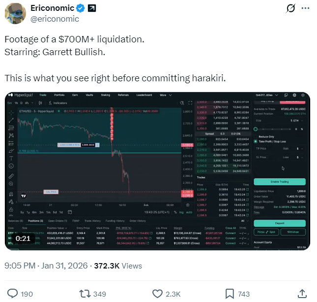 На платформі Hyperliquid зафіксували найбільшу індивідуальну ліквідацію в історії крипторинку: акаунт трейдера Гаррета Булліша був примусово закритий із лонг-позицією понад $700 млн. Це сталося на хвилі масових ліквідацій внаслідок падіння біткоїна та загального обвалу ринку.