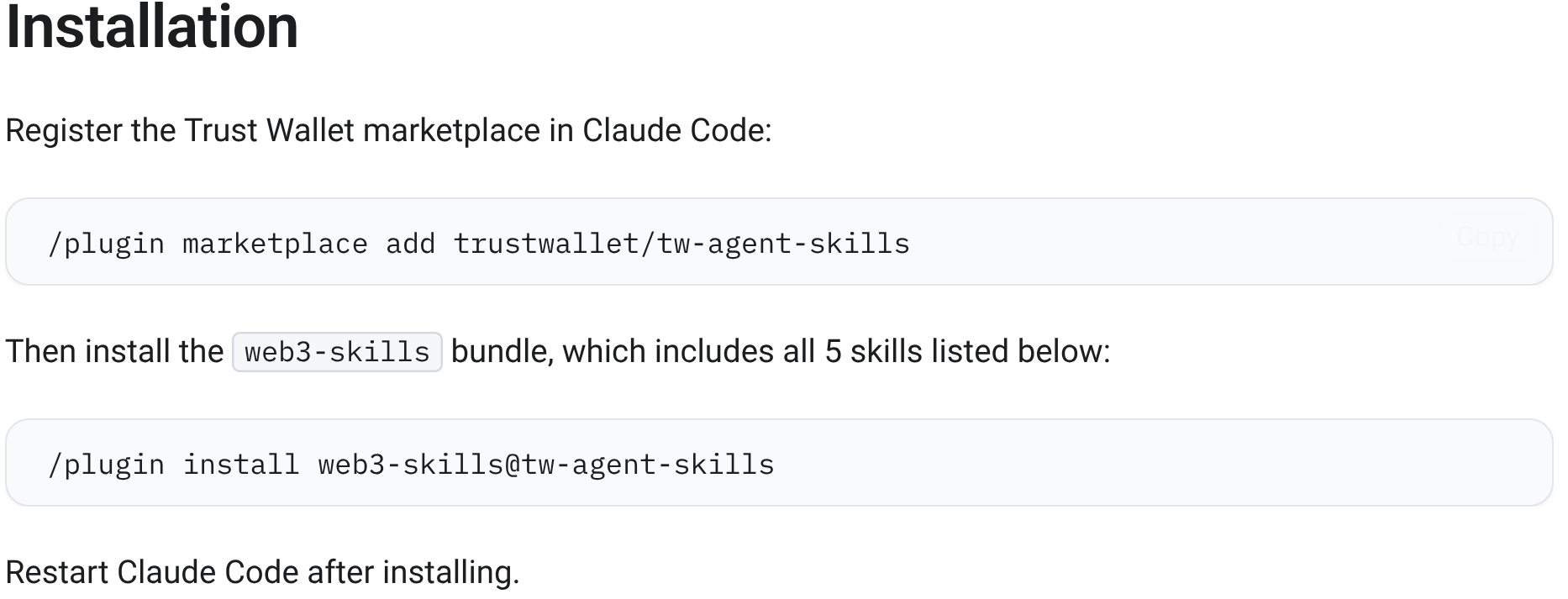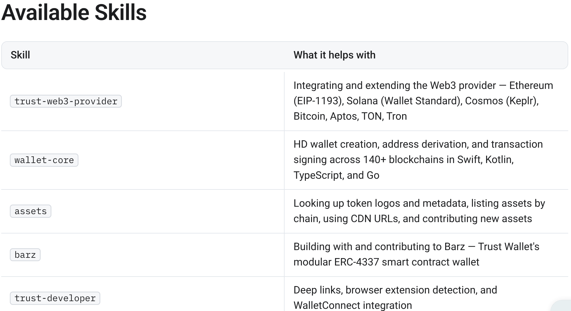 Що саме доступно зараз у Trust Wallet: MCP-сервер (Model Context Protocol) — стандарт, який дозволяє AI-агентам напряму підключатися до даних та інструментів Web3, наприклад переглядати документацію, баланс, транзакції, викликати API-функції без ручних інтеграцій. Маркетплейс навичок Claude Code містить пакети Web3-функцій, серед яких інтеграція з провайдерами Web3 (Ethereum, Solana, Cosmos, Bitcoin, Aptos, TON), управління HD-гаманцями, генерація адрес та підписання транзакцій більш ніж для 140 блокчейнів у бібліотеках Swift, Kotlin, TypeScript, Go. Про це Trust Wallet у досить схематичному вигляді сповістив у соцмережі Х.