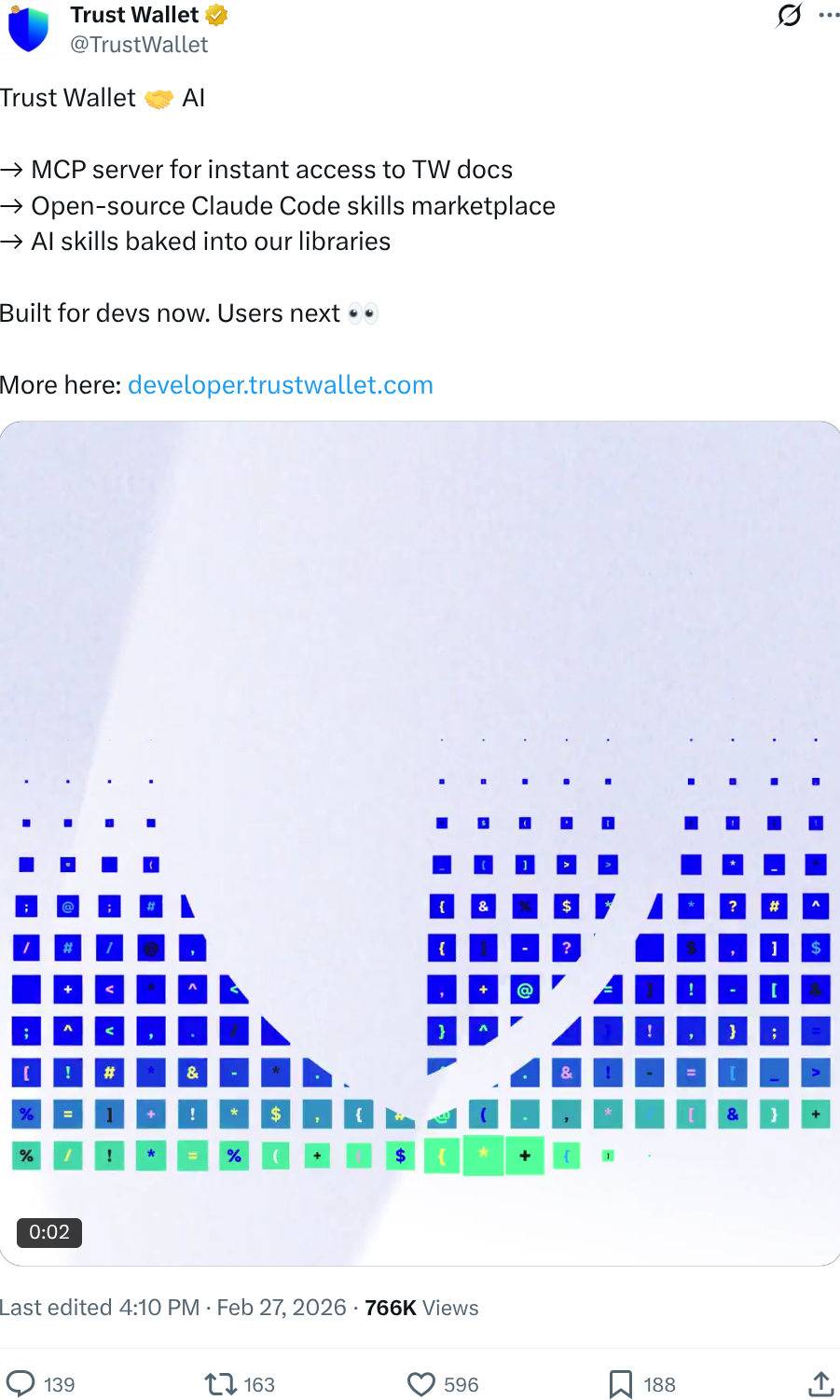 Оновлений Trust Wallet почав інтеграцію ШІ-агентів із Web3-функціями через відкриті протоколи. На першому етапі можливості доступні тільки розробникам через MCP-сервер і набір “skills” для Claude Code. Незабаром ці інструменти стануть доступними безпосередньо користувачам гаманця.