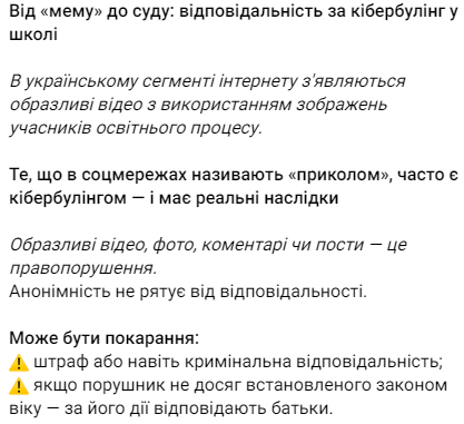 24 квітня Національна поліція України оприлюднила заяву: публікація образливих мемів і відео з фотографіями вчителів у соціальних мережах є кібербулінгом і тягне за собою реальну юридичну відповідальність. Вона може бути і кримінальною.