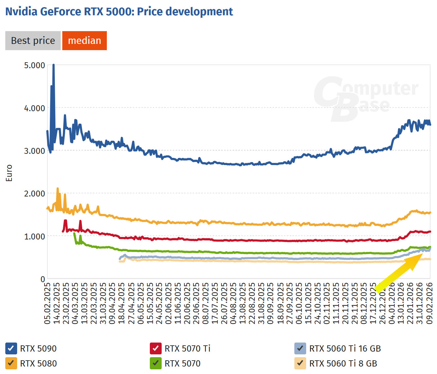 Протягом кількох тижнів у січні ціни на відеокарти зростали, а потім навіть трохи знизились для переважної більшості GPU GeForce RTX 5000.