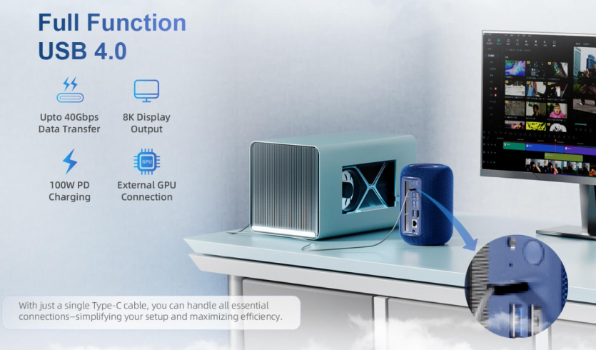 Міні-ПК GTBOX T1 містить процесор AMD Ryzen 7 8745HS, який пропонує 8 ядер на базі архітектури Zen 4 та інтегровану графіку Radeon 780M на базі RDNA 3. Такий чип зазвичай використовують у потужних ноутбуках, тому для міні-ПК він забезпечує гідну продуктивність і підтримку сучасних інтерфейсів. При цьому виробник навіть згадує про запуск ігор у Full HD. Новинка дозволяє виводити зображення на 3 монітори одночасно.