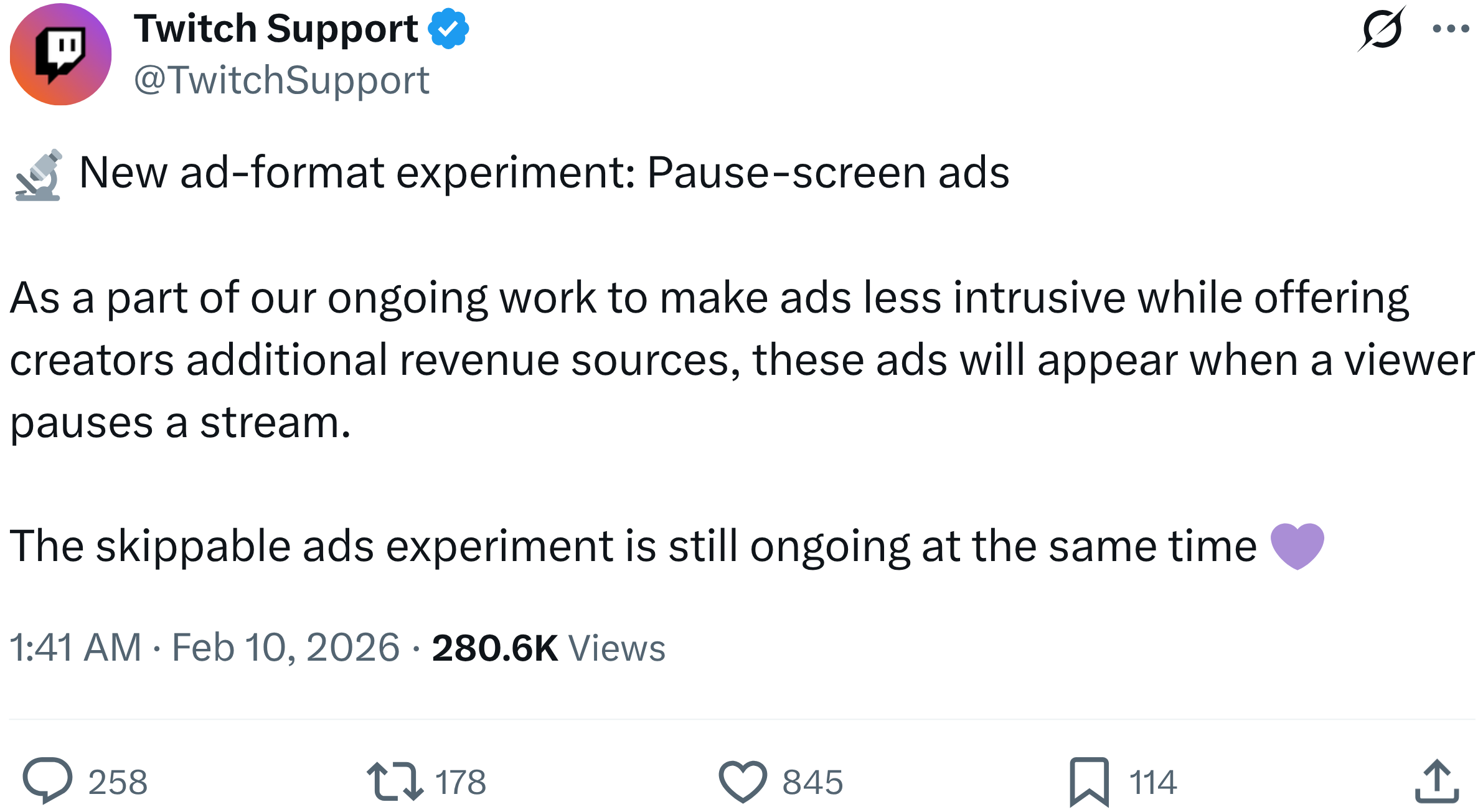 Нова функція називається pause‑screen ads — “реклама на екрані паузи”. Відповідно до офіційного оголошення Twitch у X від 9 лютого 2026 року, такі оголошення будуть з’являтися, коли користувач призупиняє перегляд стріму. Компанія позиціонує цей формат як менш нав’язливий, оскільки він не перериває активний перегляд, а також потенційно відкриває нові можливості монетизації для авторів контенту.
