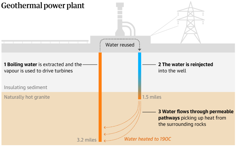 Гаряча вода, нагріта породами глибоко під землею, використовується для обертання турбін і виробництва електроенергії. Обсягів першої британської ГеоТЕС вистачить на забезпечення електроенергією 10 000 будинків. Плюси подібних електростанцій в тому, що вони дають змогу забезпечити безперервну генерацію, незалежно від погоди; до того ж в процесі не використовується паливо.