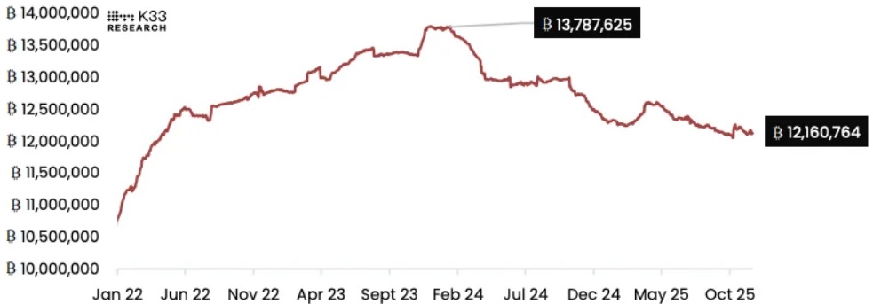 На цьому тлі фахівці з K33 фіксують багаторічний структурний зсув у поведінці ранніх власників біткоїна. За даними компанії, за останні два роки було реактивовано близько 20% усієї пропозиції BTC — приблизно 1,6 млн монет, що за поточними цінами оцінюється у $138 млрд. У K33 зазначають, що це одна з найбільших фаз розподілу довгострокової пропозиції за всю історію активу, поступаючись лише 2017 року. Загалом у 2025 році, за оцінкою K33, було реактивовано біткоїнів віком понад один рік на суму близько $300 млрд.