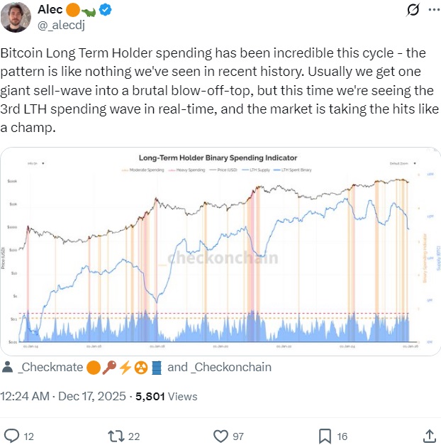 Паралельно з цими заявами ончейн-дані фіксують зміну поведінки довгострокових власників біткоїна. За даними Glassnode, обсяг BTC у руках так званих long-term holders — адрес, що утримують монети не менше 155 днів, — скоротився до 14 342 207 BTC, що є мінімумом за останні вісім місяців. Це співпало з корекцією майже на 40% від історичного максимуму жовтня. Поточне зниження стало вже третьою хвилею розподілу з початку 2023 року.