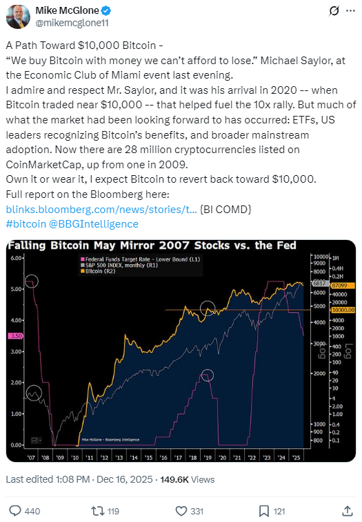 Свою позицію МакГлоун виклав у соцмережі X, коментуючи вислів співзасновника Strategy Майкла Сейлора, який заявив, що компанія купує біткоїн, використовуючи капітал, втрату якого не може собі дозволити. Аналітик Bloomberg нагадав, що саме Strategy стала одним із каталізаторів потужного ралі у 2020 році, коли ціна біткоїна перебувала поблизу $10 000.