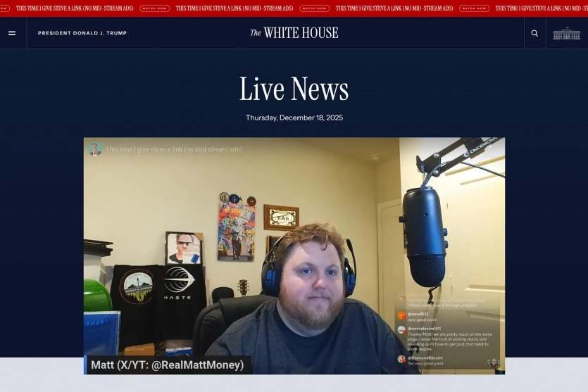 Стрим вів блогер RealMattMoney. На скриншоті Bloomberg його видно в розділі “Live News” на сайті Білого дому: типовий стрімерський сетап, геймерські навушники, темно-сіра футболка. Поверх відео — чат трансляції, де глядачі хвалять його аналітику. Під вікном відео — назва стриму, оформлена елегантним шрифтом Білого дому, з обіцянкою “без реклами посеред стріму”, а також невеликий опис із пропозицією знижки $10 за кліком на посилання сервісу StreamYard.