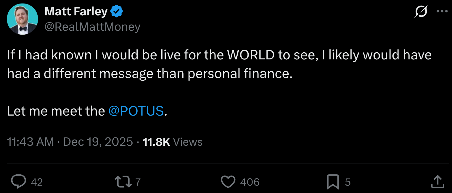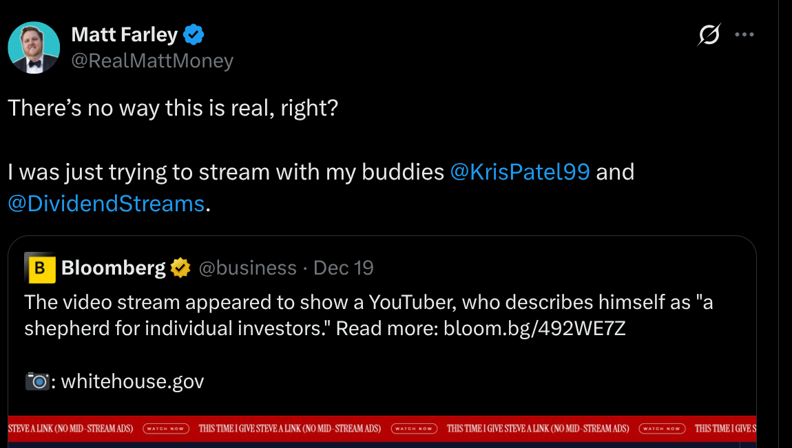 За даними Bloomberg, трансляція була видима в розділі “Live News” на офіційному сайті Білого дому незадовго до опівночі в четвер, з’являючись і зникаючи протягом приблизно години. Сам 34-річний блогер RealMattMoney, справжнє ім’я якого Метт Фарлі, дає своїй аудиторії інвестиційні поради. Поза камерою він працює нафтовим інженером у Техасі та є прихильником президента Трампа, повідомив він Bloomberg. Він також стверджує, що не мав жодного уявлення про те, що відбувається.