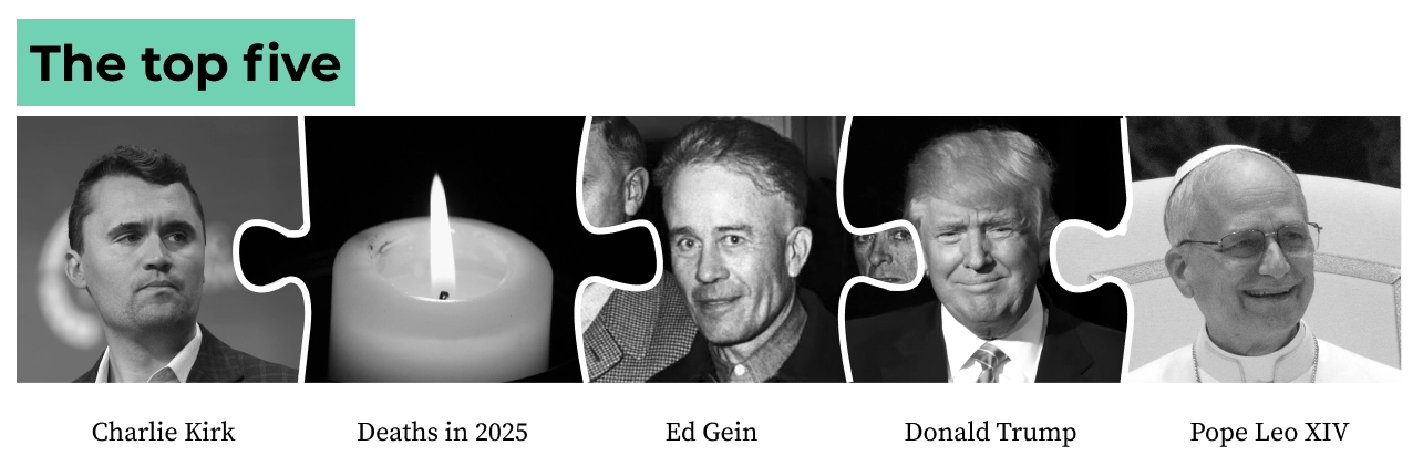 Протягом року юзери витратили понад 2,4 млрд годин на перегляд англійських сторінок. Абсолютним лідером стала стаття про вбивство американського активіста Чарлі Кірка. Після інциденту до нього різко зріс інтерес: лише наступного дня після події сторінку відкрили 15 млн разів, у середньому понад 170 разів на секунду. За рік вона набрала майже 45 млн переглядів, причому 43% трафіку прийшло з-за меж США.