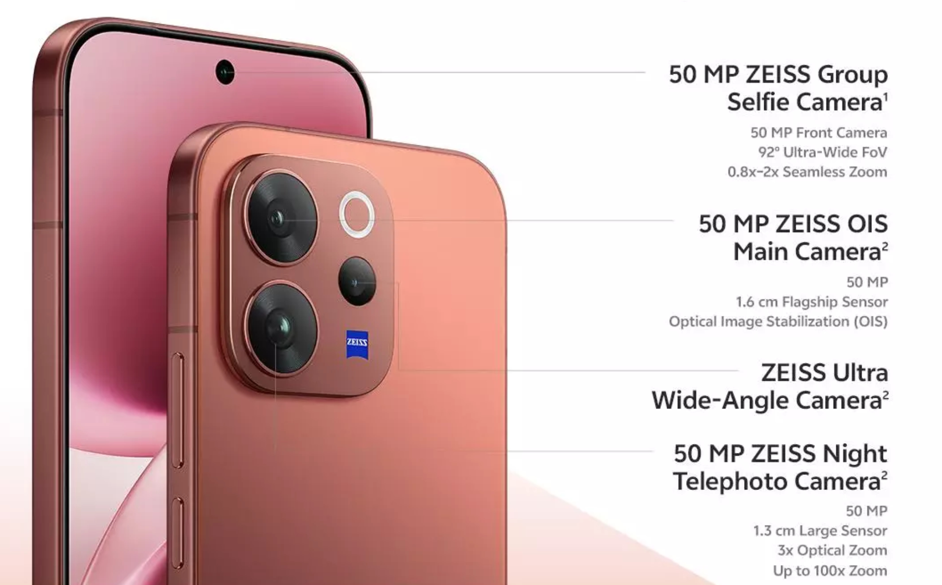 Головна камера теж потрійна. Вона містить ширококутний модуль на базі сенсора 50 МП Sony LYT-700V з OIS, телефото модуль на базі Sony IMX882 (50 МП) з 3-кратним оптичним зумом та OIS, а також 8 МП ультраширококутний модуль. Батарея — та сама 6500 мА·год із зарядкою 90 Вт. Корпус забезпечує захист від пилу та води за стандартом IP69.