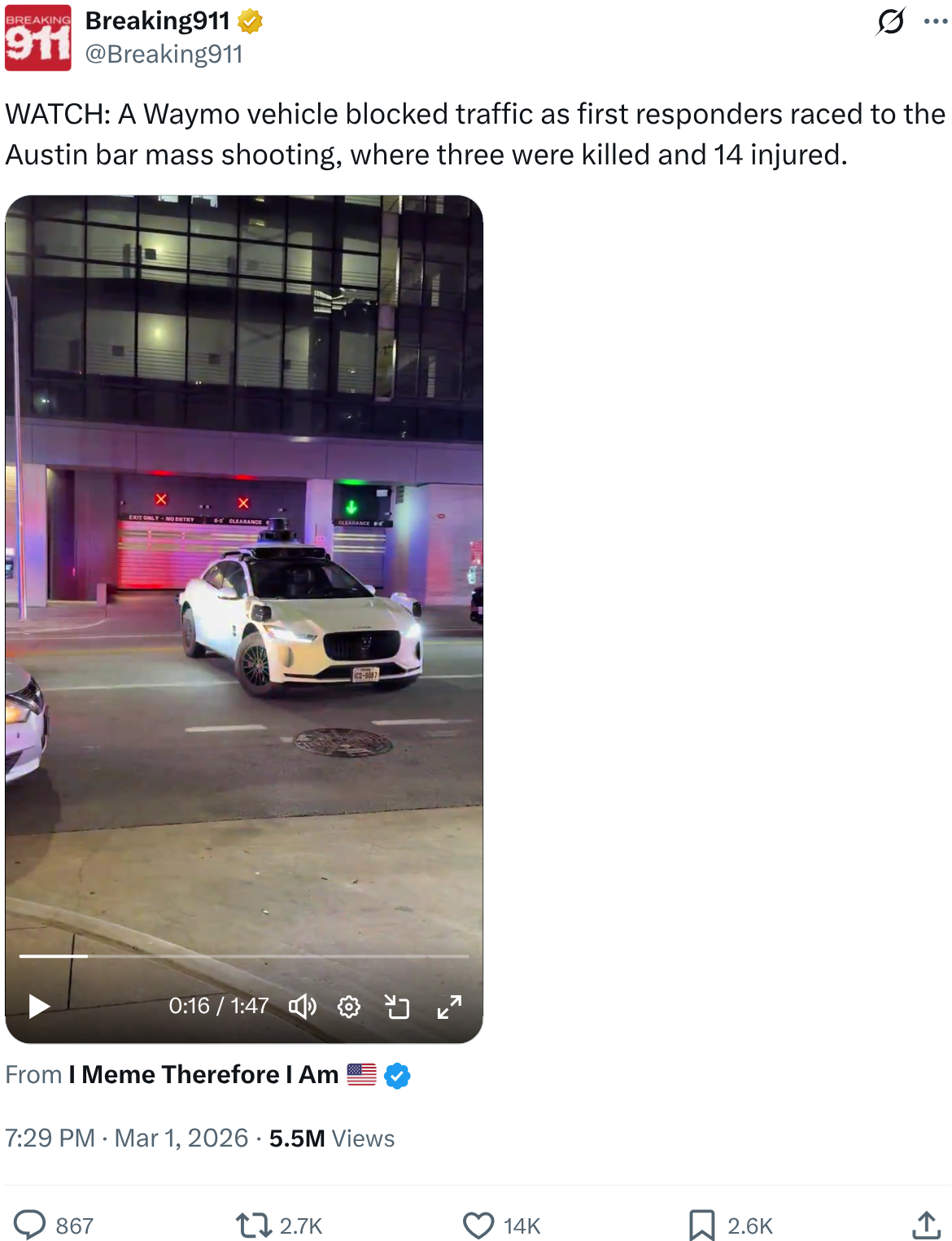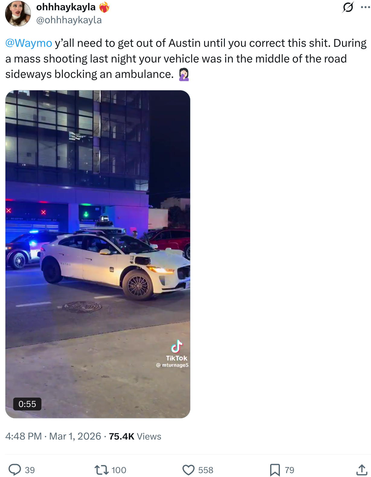 “Безпілотний автомобіль зупинився в цьому районі, коли наші екіпажі реагували на сьогоднішню стрілянину, і він ненадовго перешкодив доступу однієї швидкої. Офіцер на відео дотримався встановленого протоколу для вирішення ситуації і швидко перемістив транспортний засіб, щоб підрозділи ATCEMS могли продовжити роботу”, — заявила речниця Austin-Travis County EMS Крістa Стедмен виданню Axios.