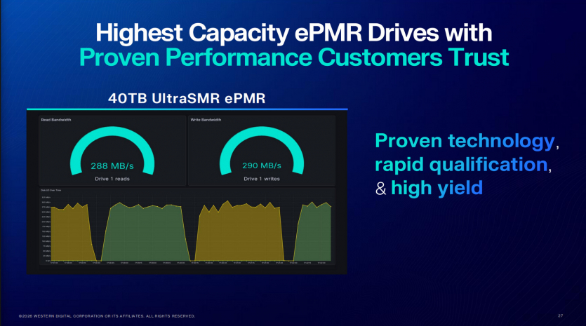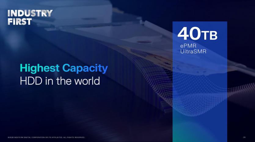 Паралельно WD підтвердила, що HDD UltraSMR ePMR місткістю 40 ТБ уже проходить кваліфікацію у двох гіперскейлерів. Масове виробництво цього накопичувача компанія планує розпочати у другій половині 2026 року.