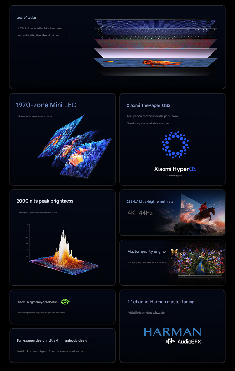 Для порівняння, в Європі наразі пропонуються телевізори Xiaomi S Mini LED TV діагоналлю до 98 дюймів, що мають до 880 зон локального затемнення, а пікова яскравість сягає лише 1200 ніт.